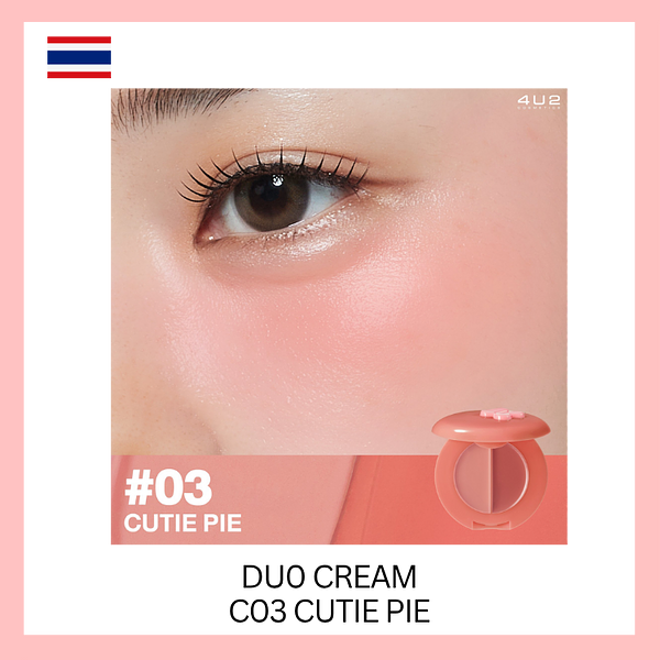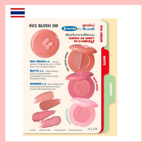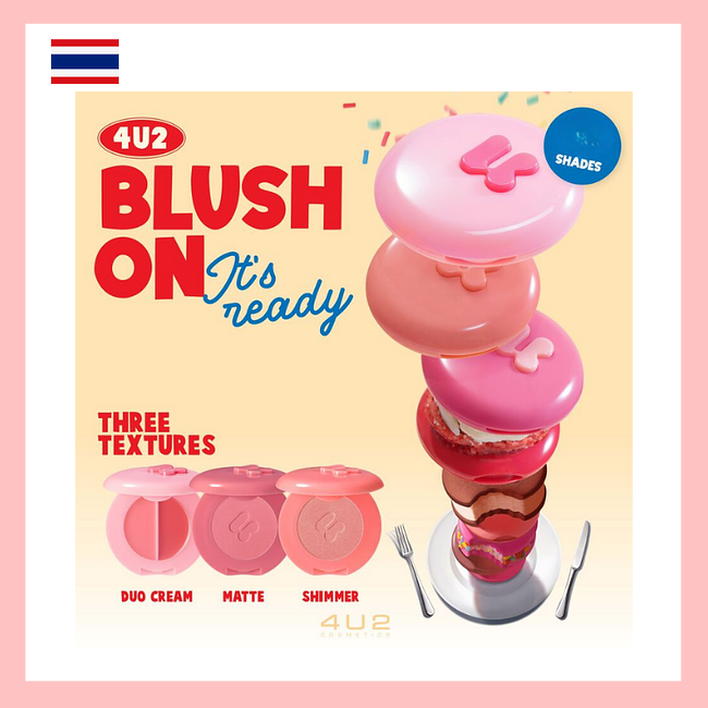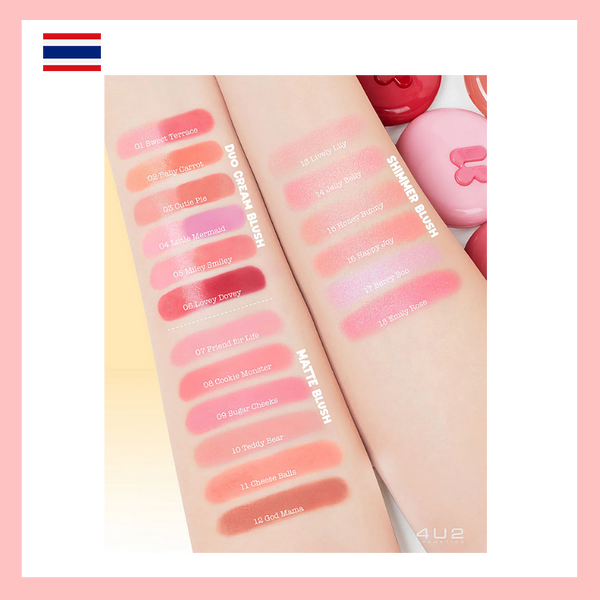 Product of Thailand 4U2 Blush On [2.8g] 3 textures - duo cream, matte, shimmer C02 Baby Carrot (duo cream) C03 Cutie Pie (duo cream) M10 Teddy Bear (matte blush) S16 Happy Joy (shimmer blush) A lightweight, cream blush that blends seamlessly into the skin without leaving streaks. Featuring LumiFilm Oil technology, it adds a dewy glow to the cheeks. Comes in two shades in one compact, allowing you to mix and match colors as desired, giving a soft, vibrant, and lively finish. Key Benefits - The cream has a lightweight texture, is easy to spread, blends seamlessly into the skin, and does not leave any residue. - Helps add a radiant glow to the cheeks. - Gives a beautiful, soft, bright, and vibrant finish. - This product is vegan, cruelty-free, and safe for pregnant women to use. - Free from parabens, alcohol, and fragrance.